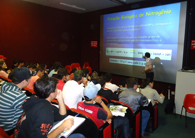 Os acadêmicos do 3º período de Agronomia noturno participaram de palestra sobre Fixação Biológica de Nitrogênio (FBN), ministrada pelo pesquisador da Embrapa Soja de Londrina, Dr. Marco Antonio Nogueira. A atividade faz parte do projeto sobre Agricultura Sustentável, desenvolvido pelos professores Esmael Lopes e Ana Paula Mourão. Na palestra, o pesquisador destacou as respostas pontuais sobre a necessidade de adubação nitrogenada em soja. Para o palestrante, a Fixação Biológica de Nitrogênio é capaz de suprir as necessidades de nitrogênio da soja, desde que haja inoculação adequada das sementes. "Por meio desse processo o produtor deixa de gastar com o produto industrial e o ambiente ganha pela menor utilização de adubos químicos derivados do petróleo", conta Marco Antonio Nogueira.