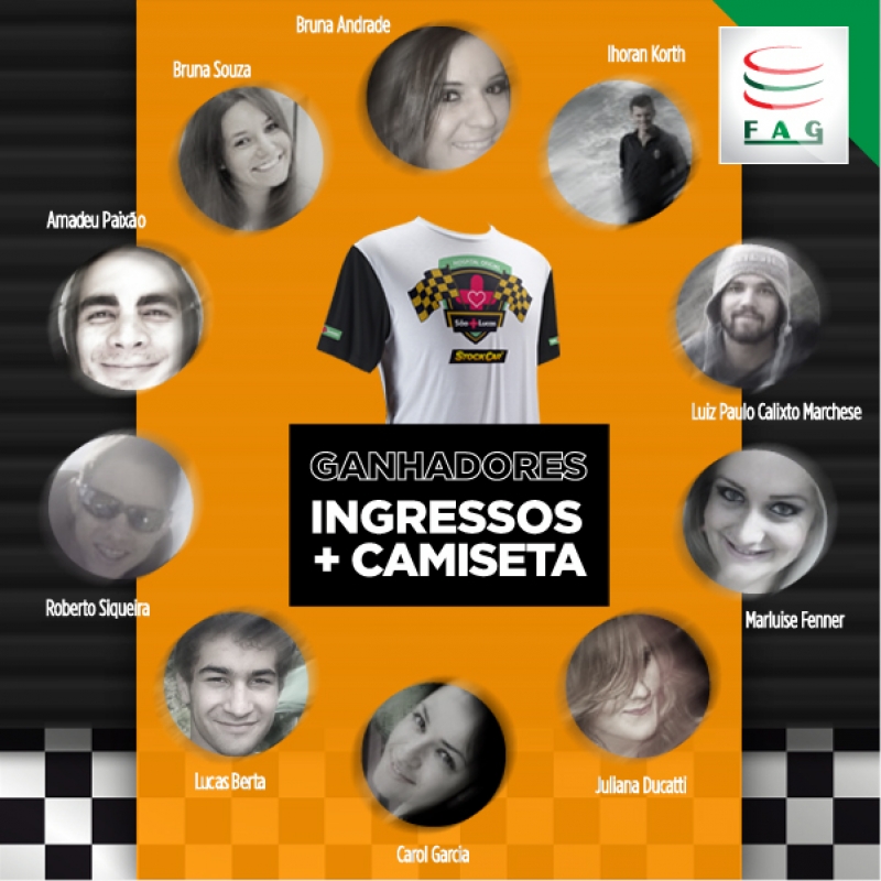 Foram divulgados os nomes dos ganhadores da promoção "GP Cascavel de Stock Car na faixa", que aconteceu em nosso Facebook. Os dez mais criativos que o São Lucas vai levar para a Stock Car são: Bruna Souza; Bruna Andrade; Roberto Siqueira; Lucas Berta; Luiz Paulo Calixto Marchese; Carol Garcia; Marluise Fenner; Ihoran Korth; Juliana Ducatti e Amadeu Paixao. Os ganhadores levaram além do ingresso, uma camiseta. Para conhecer as frases dos vencedores acesse o Facebook da FAG, em www.facebook.com/fundacaoassisgurgacz.