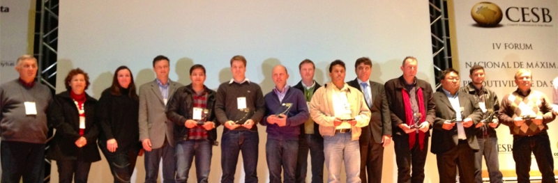 Mais de 200 alunos e egressos do curso Agronomia participaram do Fórum Nacional de Produtividade Máxima de Soja, que aconteceu no Anfiteatro da FAG, na última semana. No evento, cerca de 500 produtores, agrônomos e profissionais relacionados ao mundo do agronegócio, discutiram tecnologias e inovações da cultura. A coordenadora do curso de Agronomia, Ana Paula Moraes Mourão Simonetti, ressaltou a importância da participação dos estudantes no fórum. "Por meio da parceria entre a FAG e CESB, os estudantes tiveram acesso as novidades relacionadas a soja, além de ter a oportunidade de conversar com profissionais de todo o país. O que sem dúvida vai contribuir para a formação acadêmica", enfatiza Ana Paula. No último ano o evento aconteceu em Cuiabá. Quem levou o prêmio de campeão da região Sul e nacional do Desafio de Máxima Produtividade de Soja deste ano foi o produtor Hans Jan Groenwold e o consultor técnico Lucas Simão Hubert, do município de Castro, no Paraná. A produção alcançou 110,55 sacas por hectare. O resultado superou a edição do prêmio, que foi de 108,7 sacas por hectare, e foi muito acima da média nacional que é de 50 sacas por hectare. Os participantes tiveram a oportunidade de trocar experiências bem-sucedidas e discutirem os resultados e métodos adotados pelos campeões do Desafio 2012/2013. "A conquista dos campeões atesta o grande potencial do Brasil na produtividade da Soja, tendo como parâmetro a média nacional de colheita que é 50 sacas por hectare", afirma Orlando Martins, Presidente do CESB.