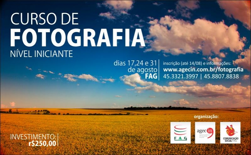 O curso de Fotografia - Nível Iniciante está com inscrições abertas. As aulas acontecem nos dias 17, 24 e 31 de agosto. O investimento é de R$ 250,00. As inscrições podem ser feitas até o dia 14 de agosto, na tesouraria da FAG, na coordenação de Comunicação Social ou no site www.agecin.com.br/fotografia. A atividade é ministrada pelo professor e coordenador dos cursos de Comunicação Social da FAG, Ralph Willians de Camargo. O profissional já trabalhou como editor e jornalista de revistas no Paraná e São Paulo, onde exerceu também as funções de fotógrafo e diagramador. A ação faz parte do projeto de extensão da faculdade, em parceria com o curso de Comunicação Social e a Agência Experimental de Comunicação Integrada (Agecin). Mais informações podem ser obtidas no telefone (45) 3321-3997.