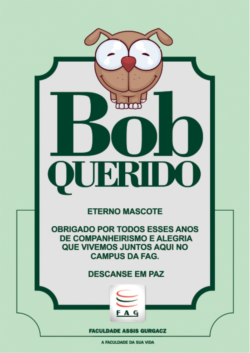 Hoje, o dia está mais cinza para os funcionários da FAG e da Asgel, o Bob, cachorrinho que morava no campus da faculdade há 13 anos nos deixou. Essa é nossa última homenagem à um grande amigo. Bob, agora você irá fazer novos amigos no céu dos cachorros.