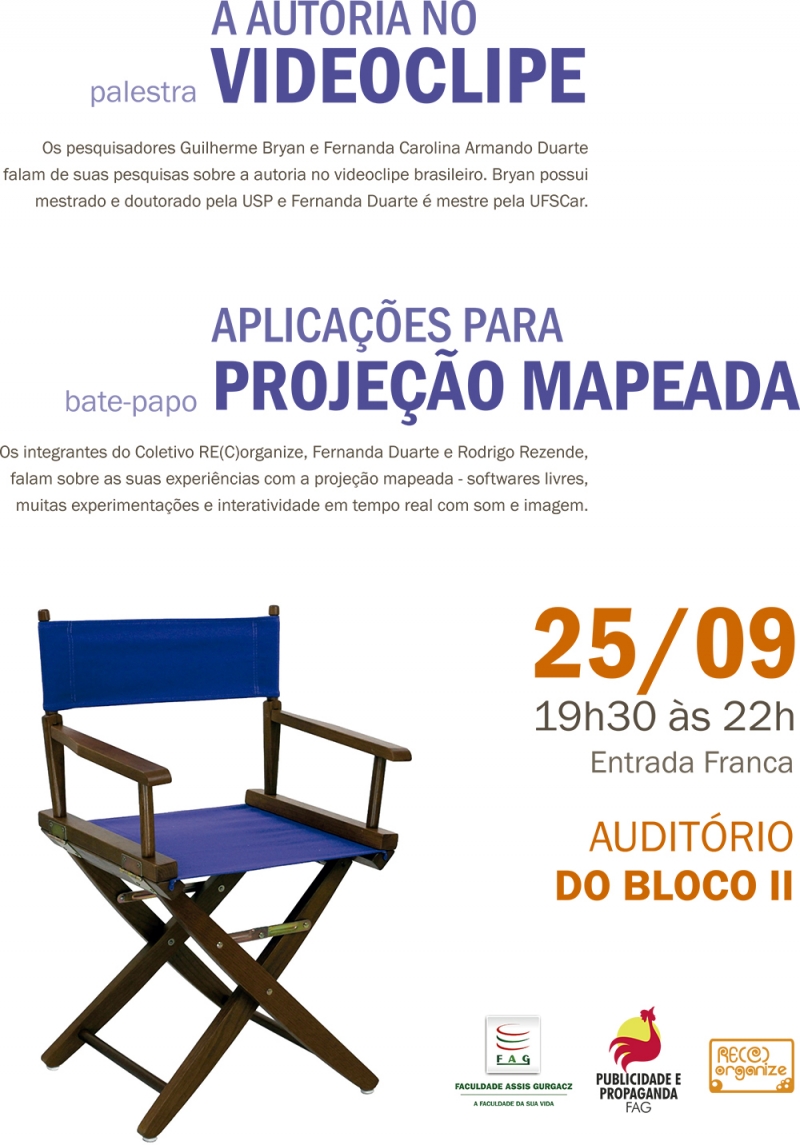 Os pesquisadores Guilherme Bryan e Fernanda Carolina Armando Duarte ministram, nesta quarta-feira (25), uma palestra sobre ?Autoria no Videoclipe Brasileiro?. A atividade é promovida por meio do curso de Publicidade e Propaganda, pela professora Laila Rotter Schmidte e é direcionada à todos os acadêmicos da graduação. Guilherme é Doutor pela USP e Fernanda Duarte é mestre pela UFSCar. Além da palestra, também acontece um bate-papo sobre "Projeção Mapeada" com os integrantes do Coletivo RE(C)organize, Fernanda Duarte e Rodrigo Rezende. A atividade acontece no auditório do Bloco 02, das 19h30 às 22h.