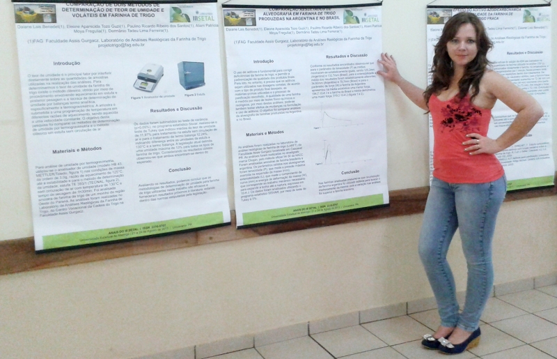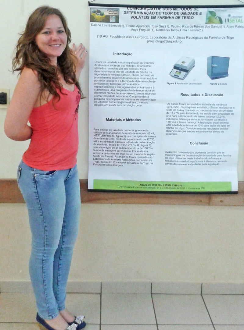 A acadêmica do 5º período de Agronomia e estagiária do Projeto Trigo, Daiane Laís Benedet, realizou duas pesquisas, com a orientação do professor Dermânio Tadeu Lima Ferreira. As publicações foram apresentadas na Semana de Engenharia e Tecnologia em Alimentos (SETAL), que aconteceu na Universidade Estadual de Maringá (UEM), campus regional de Umuarama. O primeiro trabalho foi sobre a "Influência do Teor de Umidade na Moagem do Grão de Trigo Sobre o Teor de Minerais na Farinha". A segunda publicação mostra a "Comparação dos Resultados de Alveogeografia em Farinha de Trigo Produzidas na Argentina e no Brasil". Os trabalhos foram desenvolvidos pelo Projeto Trigo, em parceria com o Centro Tecnológico de Alimentos, Bebidas e Meio Ambiente (CETABA).