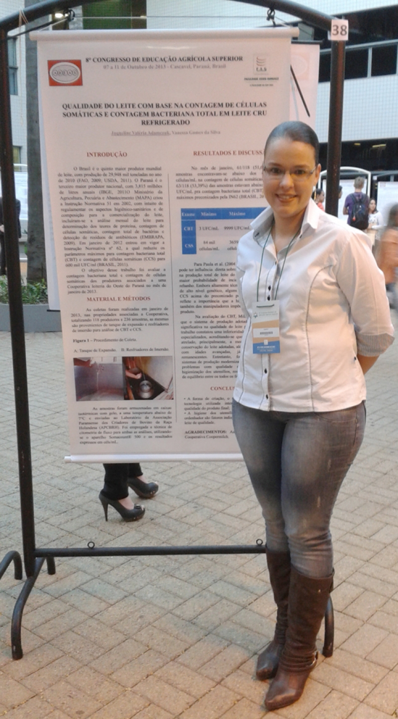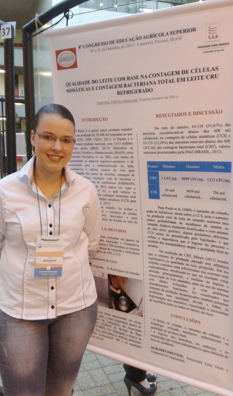 A acadêmica do 8º período de Medicina Veterinária, Jaqueline Valeria Adamczuk, teve um trabalho aprovado no 8º Congresso Brasileiro de Educação Agrícola Superior. O evento, que aconteceu na FAG, contou com a presença de pesquisadores e alunos de Medicina Veterinária e Agronomia de todo o país. O trabalho abordava a qualidade do leite e foi orientado pela professora Vanessa Gomes da Silva.