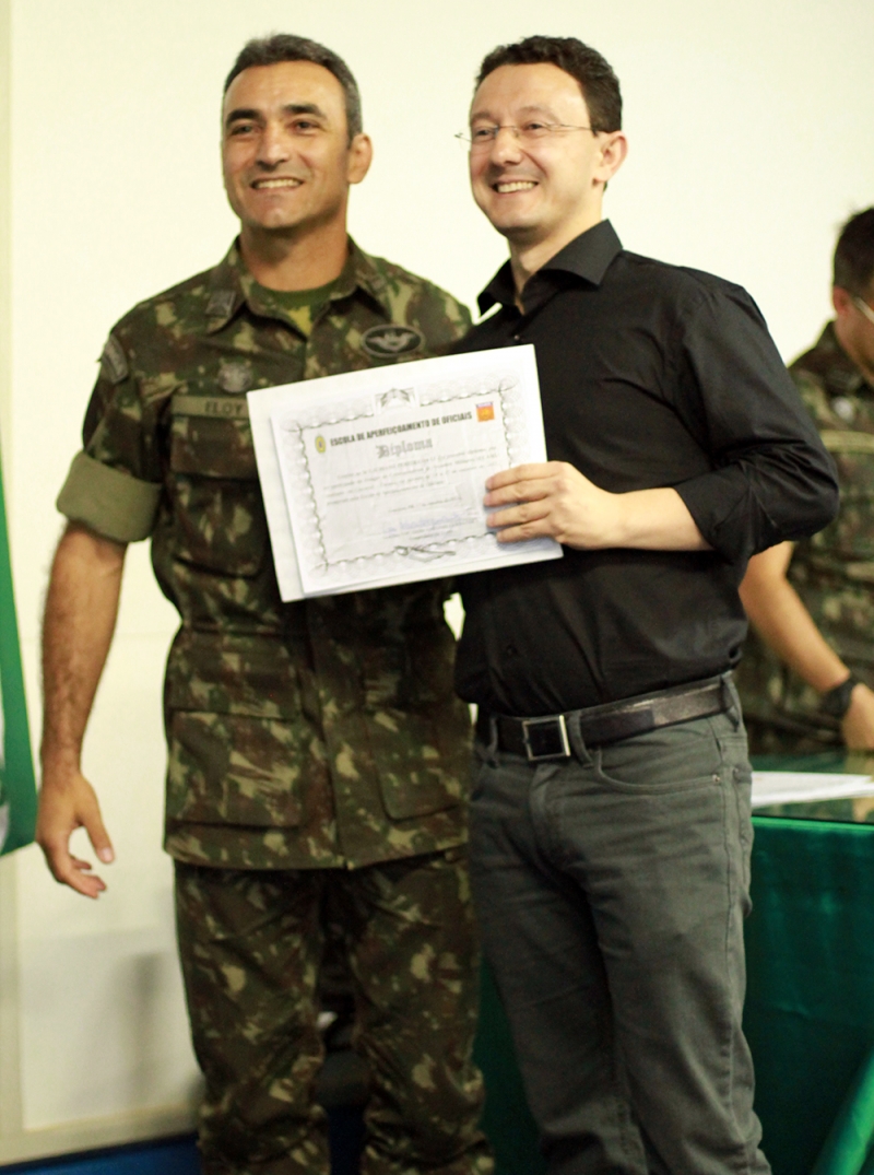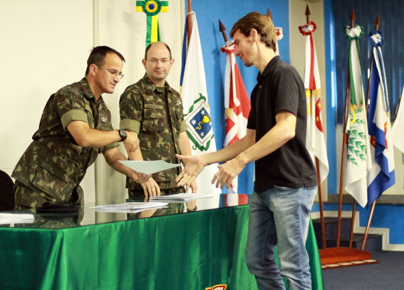Alunos dos cursos de Jornalismo, Publicidade e Propaganda e Direito, participaram do Estágio de Correspondentes para Assuntos Militares (ECAM), realizado pelo Exército Brasileiro. O curso é realizado com o objetivo de estreitar o relacionamento entre universitários e militares, de forma a ampliar as informações a respeito do Exército. Os alunos do ECAM realizaram a prática de Instrução Militar, com ênfase nas atividades de um futuro correspondente de assuntos militares, tais como: Noções de observação e orientação, técnicas de progressão em áreas de conflito, consumo de ração operacional, noções de higiene pessoal e 1º socorros em área de conflito, além de noções de direito internacional. Durante uma semana o grupo de estudantes pode conhecer um pouco melhor a rotina dos militares, passando por treinamentos físicos, táticos, operacionais e de tiro. Os acadêmicos da FAG ainda participaram de palestras e instruções sobre primeiros socorros e puderam acompanhar a simulação de manobras militares em área de conflito, com direito inclusive, a presenciar demonstração de tiros com um blindado Guarani. O aluno de Publicidade e Propaganda e estagiários da Agência Experimental de Comunicação Integrada (Agecin), Wellington Alves da Silveira, conta que ficou impressionado. "Foi muito interessante conhecer o lado dos militares, principalmente os treinamentos que fazem para tempos de guerra. Bem como diz o slogan deles, Braço forte, mão amiga. Fortes para enfrentar o inimigo, mas mão amiga da população em tempos de paz", destaca.