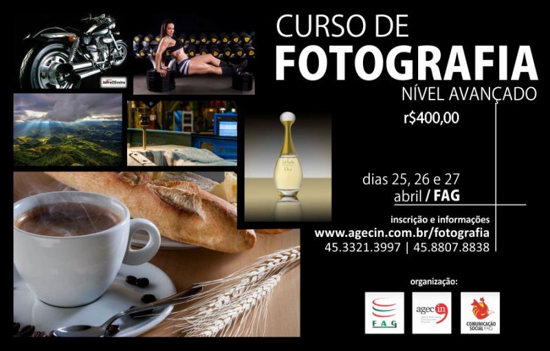 Mais de 400 alunos já passaram pelo curso de Fotografia Nível Iniciante e agora o curso de Comunicação da FAG irá ofertar o curso em Nível Avançado. A atividade acontece nos dias 25, 26 e 27 de abril e será ministrada pelo fotógrafo paulistano Joffre Oliveira. Com 75% de atividades práticas, as aulas proporcionam uma maior imersão ao mundo fotográfico, ao mesmo tempo em que enfatizam e ampliam a teoria ensinada. O curso é ofertado pela Agência Experimental de Comunicação Integrada (Agecin) e conta com mais cinco cursos na área de fotografia. Para mais informações sobre os cursos acesse www.agecin.com.br, no link "Curso de Fotografia". Mais informações pelo telefone (45) 3321-3997. Joffre Oliveira Fotógrafo desde 1987, com ampla experiência em diversos segmentos de mercado. Foi professor de laboratório branco e preto no Museu de Arte Contemporânea de Campinas, professor dos cursos de fotografia básica, intermediária e avançada, assim como foto para ilustração e publicidade no Curso Latino Americano de Artes em Campinas. Atualmente é consultor em fotografia e edição digital da Select Studios School em Nova Iorque (EUA).