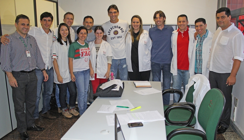 Giba, um dos maiores jogadores de vôlei, esteve nesta quinta-feira (10), na FAG, para apresentar a direção da instituição o projeto "Educação para uma Vida Saudável". Participaram da apresentação, o presidente da FAG, Assis Gurgacz, a diretora administrativa, Jaqueline Gurgacz Ferreira, o diretor acadêmico, professor Afonso Cavalheiro, o coordenador de Educação Física, Vitor Cesar Moreira, além do deputado estadual, André Bueno, do prefeito de Céu Azul, Jaime Basso, e do secretário de Esporte e Lazer, Wanderley Faust. De acordo com Giba, o projeto, que é direcionado para as crianças de 6 a 14 anos, tem como objetivo principal combater a obesidade infantil. "Nossa intenção é integrar a sociedade, os pais, a comunidade em torno dos colégios, a faculdade, os estudantes e estagiários, para juntos tirarmos as crianças das ruas e por meio de atividades esportivas e controle da alimentação reduzir a obesidade infantil", explica. Após a reunião, o ex-jogador de vôlei, conheceu o Complexo Esportivo da FAG, e aproveitou para conversar com os professores do colegiado de Educação Física, que estavam em reunião e com os árbitros de handebol, que estão na instituição para a Copa Paraná.