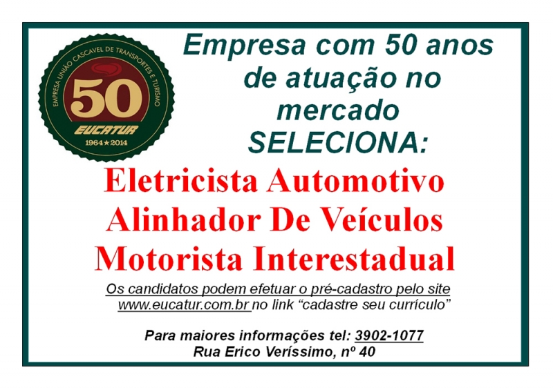 A empresa Eucatur - União Cascavel de Transporte e Turismo está com vagas de emprego disponíveis para os cargos de: Eletricista Automotivo; Alinhador de Veículos; e Motorista Interestadual. Os candidatos devem ter experiência na área desejada e disponibilidade para trabalhar por escala. Os interessados devem efetuar um pré-cadastro no www.eucatur.com.br, no link "Cadastre Seu Currículo". Para mais informações falar com Giuliano pelo telefone (45) 3902-1077. A Eucatur fica na Rua Érico Veríssimo, 40.