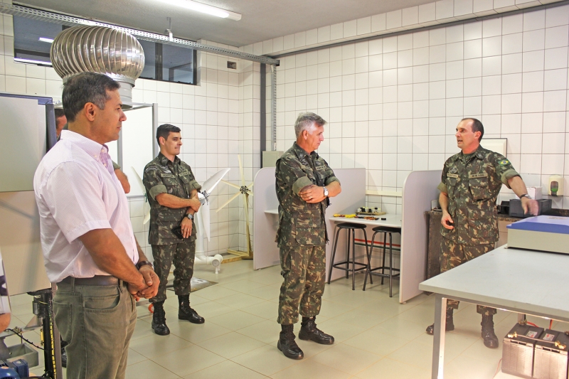 A convite do professor da FAG e sargento do Exército, Gilson Debastiani, alguns oficiais da Companhia de Comando da 15ª Brigada de Infantaria Mecanizada e do 15º Batalhão Logístico de Cascavel visitaram a FAG, na tarde da última quinta-feira (11). Os oficiais, depois de terem sido recepcionados pelo diretor geral, professor Sérgio de Angelis, conheceram o Laboratório de Engenharia, no qual Gilson trabalhou com a sua tese de mestrado, que foi defendida e aprovada no final do ano passado. O tema era a "Eficiência Energética do Sistema Híbrido: Eólico-fotovoltaico". Na época, o professor recebeu apoio financeiro e estrutural da Faculdade, visto que foram instalados três painéis solares ao lado de um gerador eólico e fotovoltaico, montado por ele. A estrutura, que antes era base de pesquisa, hoje é parte das práticas de alguns alunos dos cursos de Engenharia que buscam o professor para realizar projetos de pesquisa e extensão. Segundo o docente, foi importante ter a presença dos membros do Exército porque o conhecimento resultante da pesquisa pode auxiliar na promoção de melhorias nos modos de captação energética no Brasil. Além disso, existe a pretensão de ampliar e aplicar o projeto na prática. "A energia eólica e a solar são pouco exploradas no Brasil, mas quando analisamos fora daqui, ela tem uma relevância muito grande quando se trata das suas participações na matriz energética dos países mais desenvolvidos. O Exército foi convidado pra participar em relação à relevância do assunto e para conhecer as possibilidades de aplicar a pesquisa em áreas isoladas do Brasil", explica. General Polsin, um dos oficiais presentes, declarou, durante a visita, que ficou encantado com a estrutura da instituição e exaltou a importância da tese. "O nosso sargento, além de atuar nos trabalhos desenvolvidos normalmente no dia a dia no Quartel, é um pesquisador. É muito interessante essa área, porque envolve as energias alternativas", alega. Segundo ele, nós temos a obrigação de estudar mais sobre o assunto. "No projeto dele [Gilson], vemos o aproveitamento da energia eólica, da energia solar. É um campo muito importante a ser desenvolvido. Percebemos que há um futuro grande nessa produção de energia. O Brasil ganha com esse tipo de pesquisa desenvolvida aqui", conclui. O diretor geral, Sérgio de Angelis, se mostrou orgulhoso pelas possibilidades que se abrem com o projeto feito pelo professor e sargento. "Para nós, existem duas dimensões: a primeira é que o aluno que tem a oportunidade de acompanhar um projeto como esse, tem o processo de aprendizagem ampliado. A segunda diz respeito à produção do conhecimento cientifico; é conhecimento novo que está sendo gerado e, sobretudo, um conhecimento que tem um valor social muito grande porque estamos tratando de questões cruciais pra sociedade atual", enaltece. Ainda de acordo com Sérgio, os projetos não param por aqui. "A nossa intenção é apoiar projetos desse tipo e ampliá-los, também", salienta.