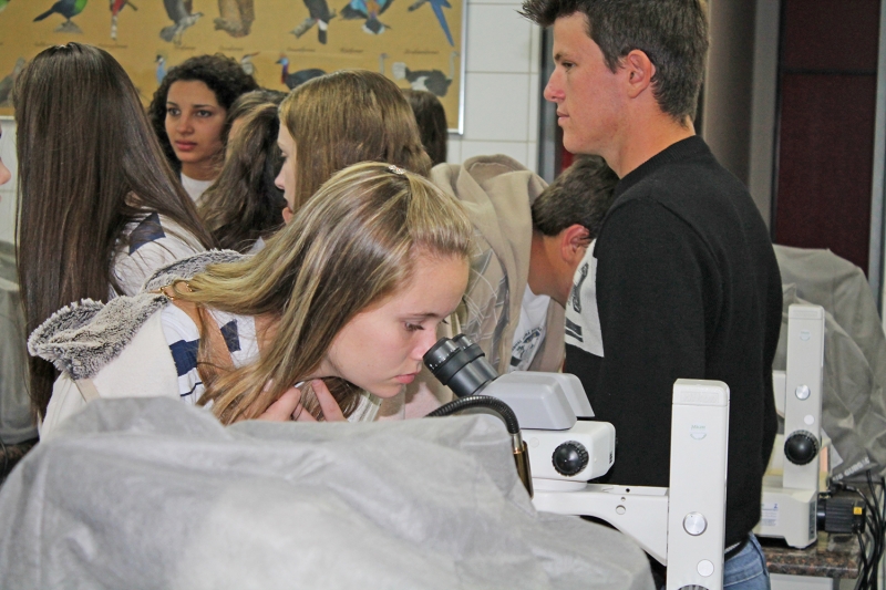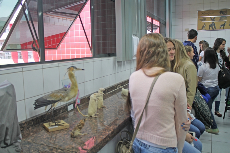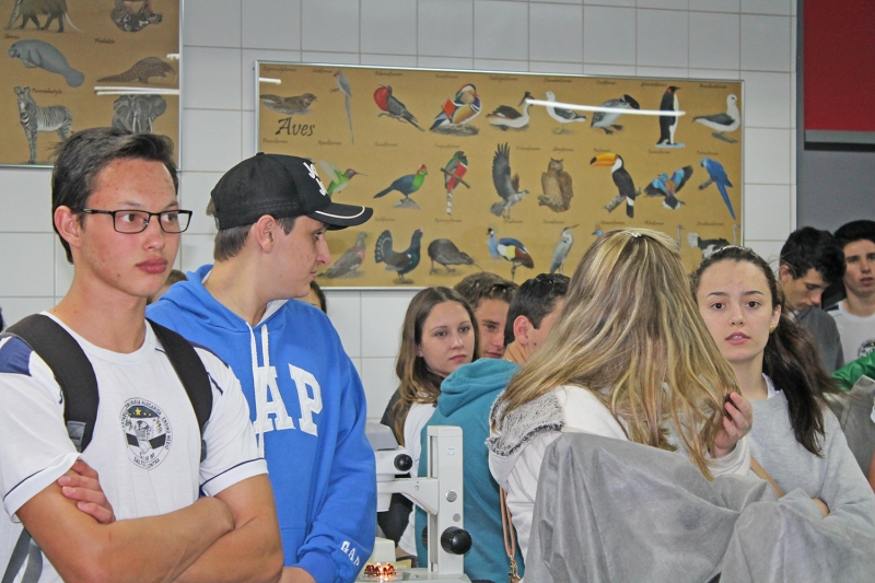 No Laboratório de Zoologia, os alunos conversaram com acadêmicos do curso de Ciências Biológicas e puderam entrar em contato com algumas das experiências que foram compartilhadas por eles como viagens, estudos e até mesmo quais áreas o biólogo pode atuar.