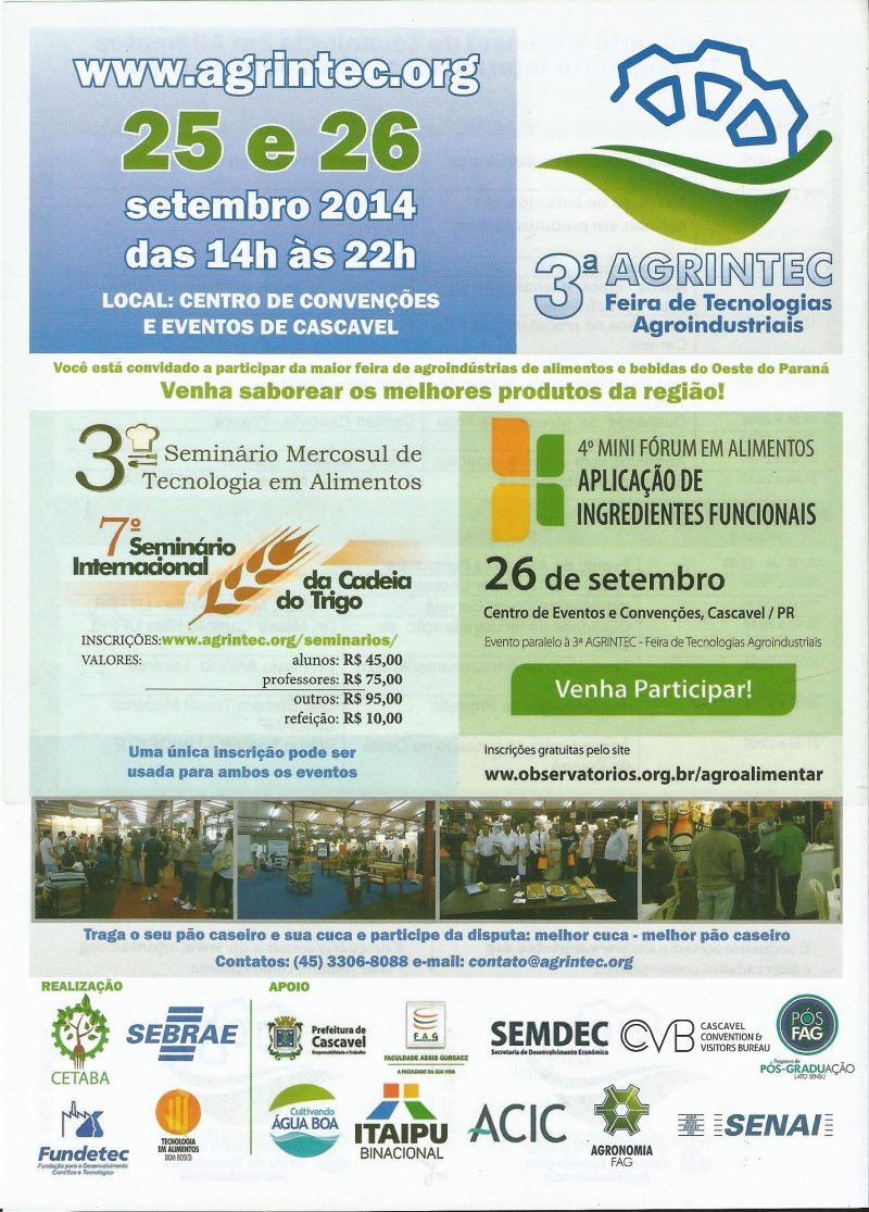 A AGRINTEC (Feira de Tecnologias Agroindustriais do Oeste) realiza mais uma edição em Cascavel e a FAG e Dom Bosco são novamente parcerias do evento. A feira acontecerá no final de semana dos dias 25 e 26 de setembro e, entre as atrações estão à degustação de produtos feitos por produtores da região, além de jantares. As palestras também ganham destaque. Serão treze, sendo que os temas englobam a industrialização da cerveja, alimentos sem glúten e especiais, qualidade da moagem de trigo, aplicação de antioxidantes naturais em produtos cárneos e vários outros.