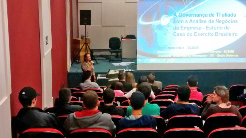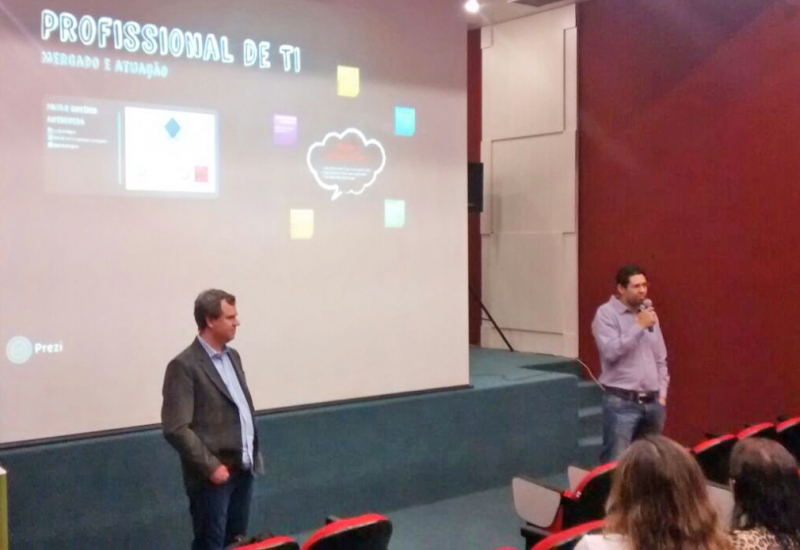 A última semana foi de muito aprendizado para os acadêmicos de Sistemas para Internet e Sistemas de Informações, já que as turmas participaram das atividades da Semana Acadêmica. As palestras começaram com a fala sobre "A Governança de TI aliada com a análise de negócios da empresa - Estudo de Caso do Exercito Brasileiro", de Luciana Paiva. Na sequência a mesa redonda com Paulo Antiqueira, da Datacoper e Vanderlei, da Seta Digital, que debateram o tema "O Que o Mercado de Trabalho Espera de um Profissional de TI".