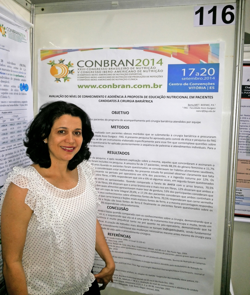 A professora Nanci Rouse Teruel Berto representou a FAG no CONBRAN - Congresso Brasileiro de Nutrição, que aconteceu em Vitória, Espirito Santo. Além de apresentar trabalhos científicos, a docente também participou de uma oficina, direcionada aos coordenadores de graduações, promovida pelo Conselho Federal de Nutrição - CFN, com o objetivo de discutir e refletir sobre a prática, formação e aprimoramento profissional.