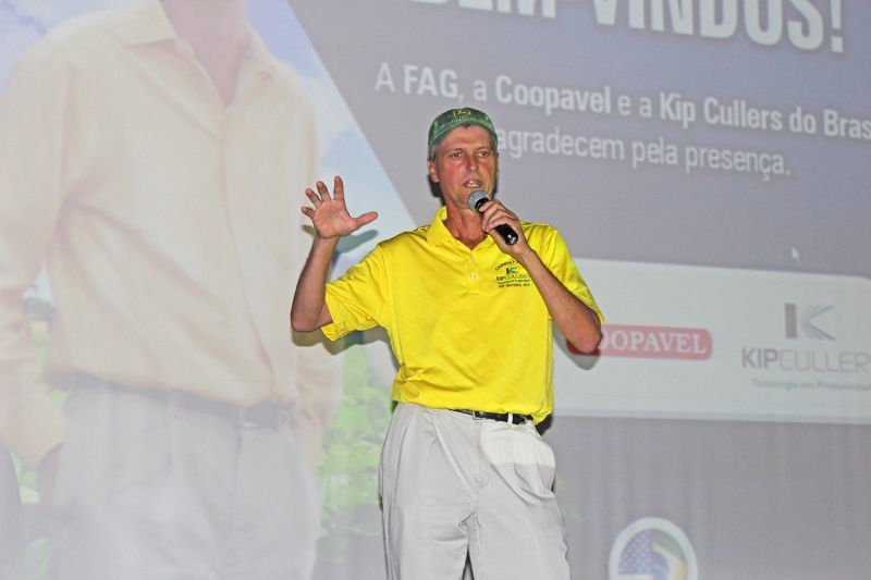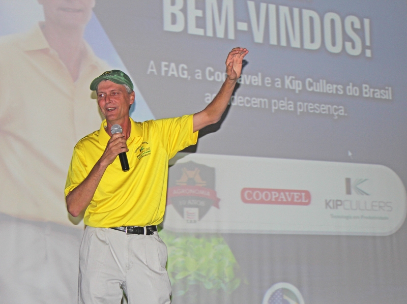 Foi com a palestra ministrada pelo maior produtor de grãos do mundo que o curso de Agronomia da FAG comemorou o dia do Engenheiro Agrônomo. Kip Cullers levou mais de 800 acadêmicos para o Anfiteatro da Reitoria e não faz segredo sobre as táticas utilizadas para alcançar uma produtividade de 173 sacas de soja e 392 de milho por hectare, a chave do sucesso é testar. "A dica que vale para todos os segmentos é sempre buscar novas tecnologias, já são 30 anos fazendo testes, na maioria das vezes não funciona, mas é preciso seguir experimentando", destaca o produtor.