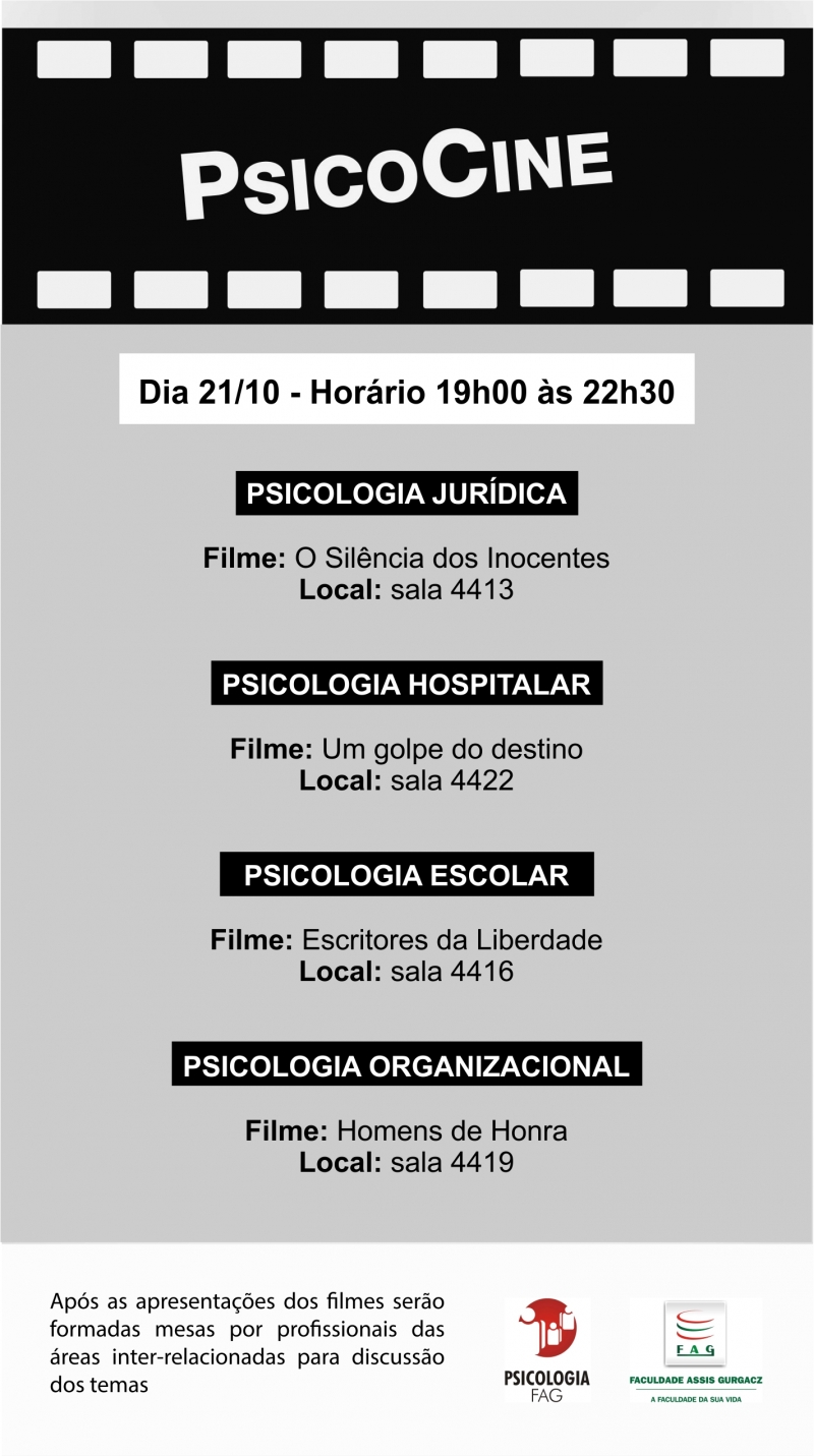 O curso de psicologia da FAG promove mais uma edição do PsicoCine. A atividade acontece nesta terça-feira (21), das 19h às 22h30. Alunos de todos os cursos podem participar!