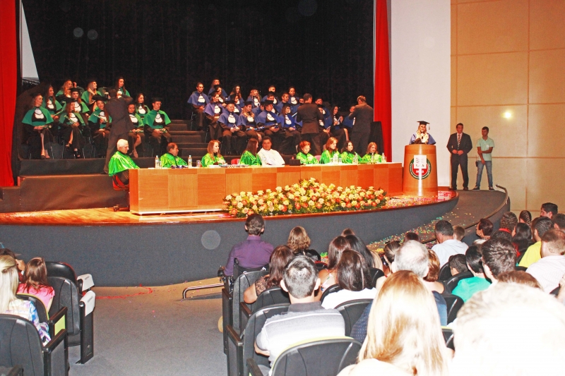 A Faculdade Assis Gurgacz realizou, na tarde de ontem (21), a cerimônia de Colação de Grau dos 25 formandos de Administração e 11 de Fonoaudiologia. A solenidade foi presidida pelo Diretor Acadêmico da FAG, professor Afonso Cavalheiro Neto e aconteceu às 17 horas, no Anfiteatro da Reitoria, que ficou lotado por familiares e amigos dos formandos.