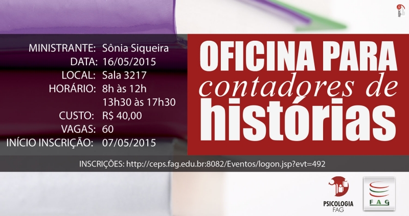 O curso de Psicologia da Faculdade Assis Gurgacz realiza, no próximo sábado (16), uma oficina para Contadores de Histórias. A atividade será coordenada pela egressa de Educação Física das FAG, Sonia Siqueira.