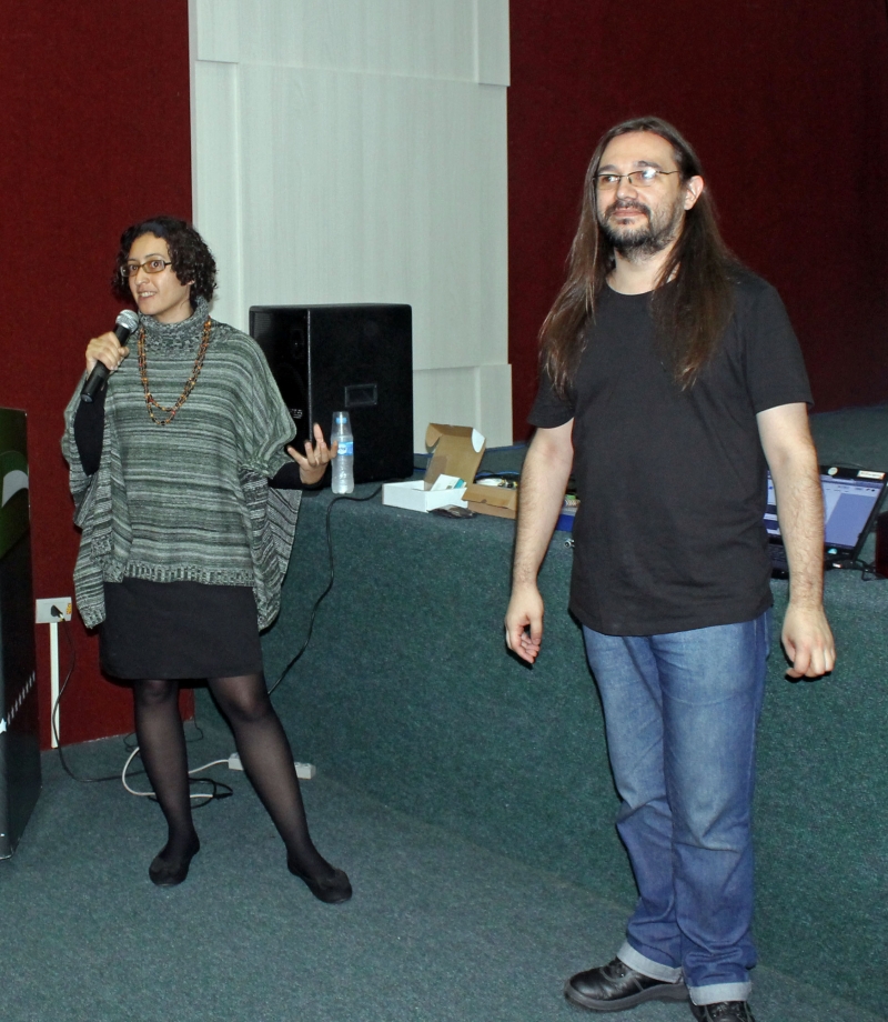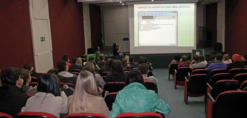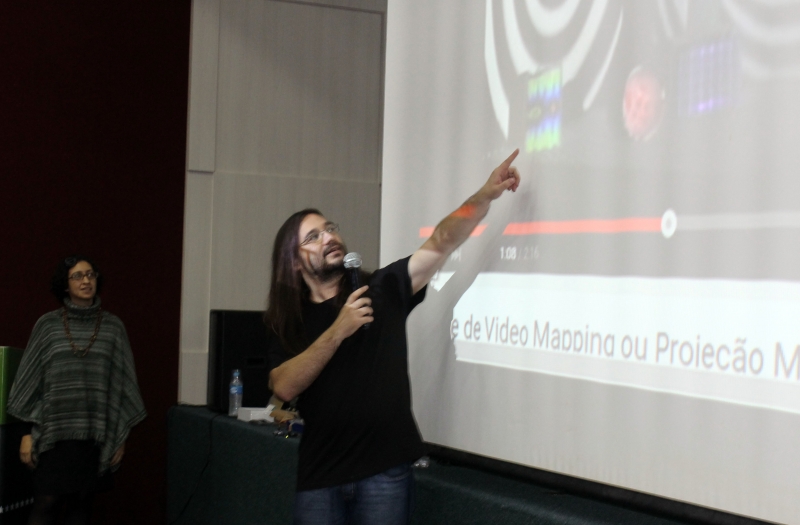 Na palestra, os integrantes do Coletivo RE(C)organize, Fernanda Duarte e Rodrigo Rezende, falaram sobre os processos criativos de suas obras e suas experiências com a interatividade aliada a diferentes técnicas projetivas, além de demonstrar alguns equipamentos utilizados na construção dos dispositivos de suas obras.