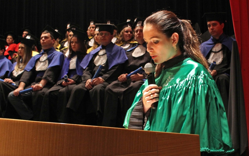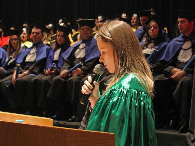 Jessica Zanotto, representante do curso de Farmácia, destacou que os estudos devem ser levados para a vida toda, uma vez que valeram a pena todos os momentos vividos na faculdade, bem como as amizades sólidas formadas, a confiança e a maturidade resultantes das experiências positivas. A Paraninfa professora Patrícia Stadler Rosa Lucca, ressaltou a primeira turma noturna que se forma, bem como a nota 4 pelo ENADE e parabenizou os pais por deixarem a profissão como herança aos filhos. A formada que obteve a maior média de notas no curso de Farmácia foi Cláudia Mara Dessanti de Freitas.