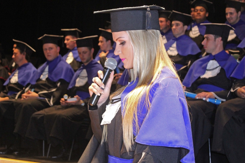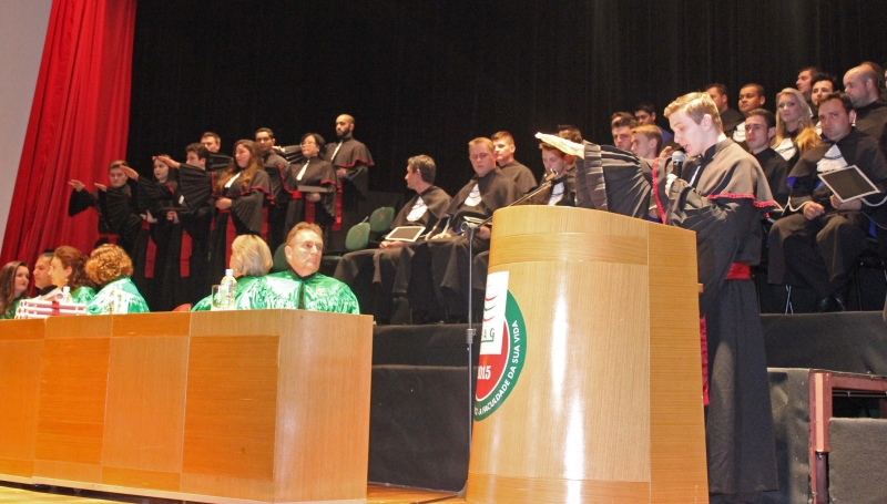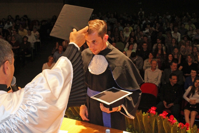 Representando o curso de Engenharia Civil, Thiago Hernani Alves Ferreira falou, em seu discurso, do convívio da turma e de como os anos de estudos contribuíram com o crescimento pessoal. O Paraninfo professor Florian Schirmer falou da peculiaridade da turma que é feita por amigos, falou também da importância de utilizar a paixão e ética nas decisões. A Coordenadora professora Debora Felten entregou a láurea acadêmica para Francieli Virginia Cavaleiro Pedron.