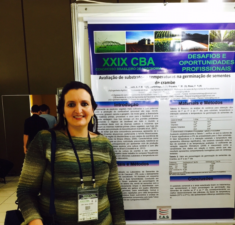 A professora Ana Paula Mourão Simonetti, coordenadora do curso, está presente no Congresso para a apresentação de quatro trabalhos, como autora ou co-autora. Os temas são os seguintes: Alelopatia do extrato de aveia sobre germinação e desenvolvimento inicial do milho; Aplicações de doses e fontes de nitrogênio na cultura do milho; Avaliação de substratos e temperaturas na germinação de sementes de crambe e Uso de fertilizantes a base de extratos de alga em rúcula. "Também fazem parte desses trabalhos ex-alunos que foram meus orientados de TCC, uma aluna, atualmente minha orientada Hingrit Siqueira e o professor Helton Rosa. Além disso, o professor Laercio Boschini, que é nosso representante junto ao CREA (conselheiro) está participando do evento e do que ocorre juntamente com o Congresso, que é o II Encontro Nacional de Agronomia", destaca.