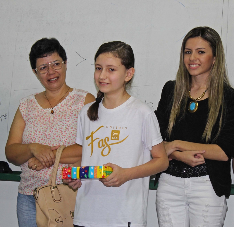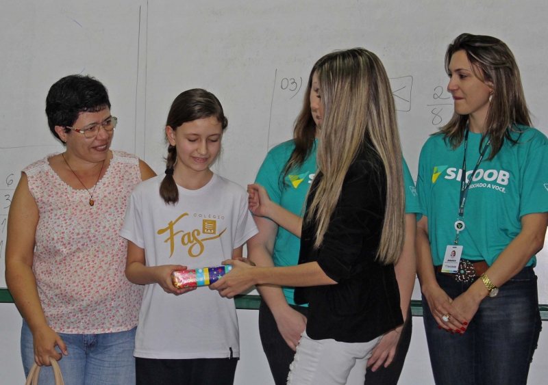 A premiação da vencedora aconteceu no Colégio FAG, na manhã de ontem (12), e contou com a presença do Diretor presidente do Sicoob Credicapital Valdir Pacini e equipe, de representantes do Instituto Sicoob, além do Diretor do Colégio FAG Givanildo Nardi, da professora Priscila Schmitk Soares e da mãe da aluna vencedora D. Rosângela. Ana Helena foi surpreendida durante a aula e recebeu o carinho dos colegas. Tímida declarou estar muito feliz com a conquista. A estudante recebeu um tablet como prêmio e a professora Priscila R$ 500,00.