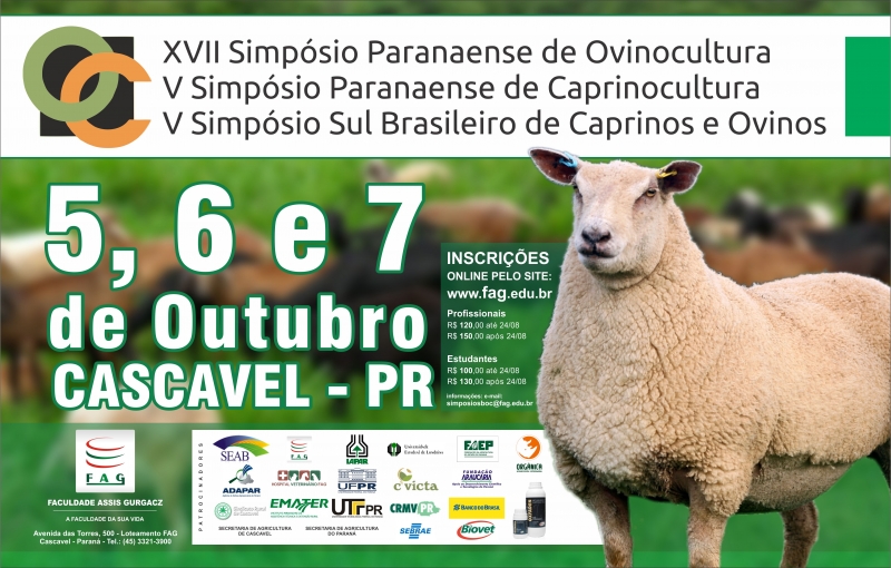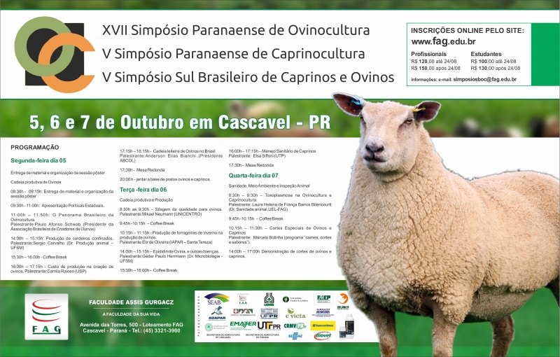 O curso de Medicina Veterinária da FAG está organizando nos dias 05, 06 e 07 de outubro, o XVII Simpósio Paranaense de Ovinocultura, V Simpósio Paranaense de Caprinocultura, V Simpósio Sul Brasileiro de Caprinos e Ovinos. As inscrições serão online, pelo site da FAG e custam R$ 100,00 para estudantes e 120 para profissionais que efetuarem pagamento até 24 de agosto, sendo que após esta data o valor será 130,00 (estudantes) e 150,00 (profissionais). Para se inscrever, clique aqui.