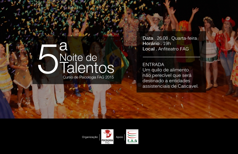 O curso de Psicologia da Faculdade Assis Gurgacz promove a 5ª edição da Noite de Talentos. O evento acontece no anfiteatro da reitoria, no dia 26 de agosto, às 19 horas, com o tema "Cinema: 120 anos de Lumière". A Noite de Talentos é um evento consolidado no curso de psicologia da FAG cujo objetivo é promover a interação entre acadêmicos e professores do próprio curso.