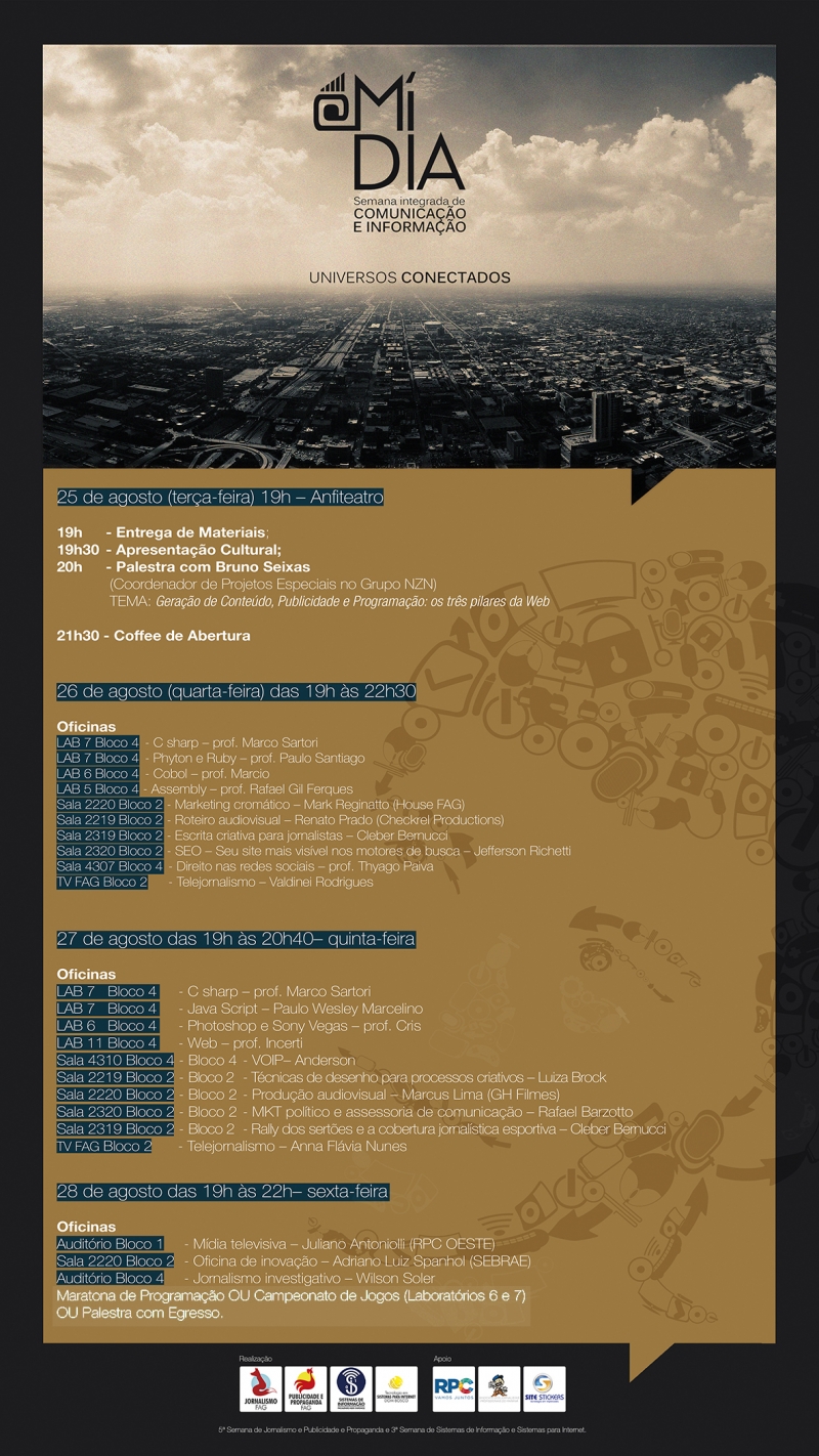 Amanhã (25) começa o @Mídia, a Semana Acadêmica Integrada dos cursos de Jornalismo, Publicidade e Propaganda e Sistemas de Informação da FAG e Tecnologia em Sistemas para Internet da Faculdade Dom Bosco, com o tema: "Universos Conectados".