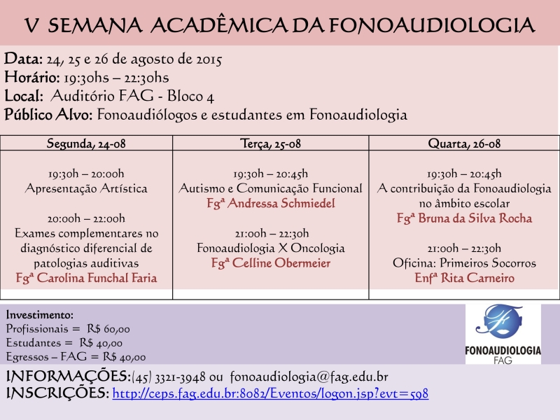 Começa hoje (24) a 5ª Semana Acadêmica de Fonoaudiologia da FAG. O evento, voltado a fonoaudiólogos e estudantes em Fonoaudiologia, segue até quarta-feira (26), com palestras e oficinas. Interessados ainda podem se inscrever no site da Faculdade. O valor da inscrição para estudantes e egressos da FAG é de R$ 40,00 e para profissionais custa R$ 60,00.