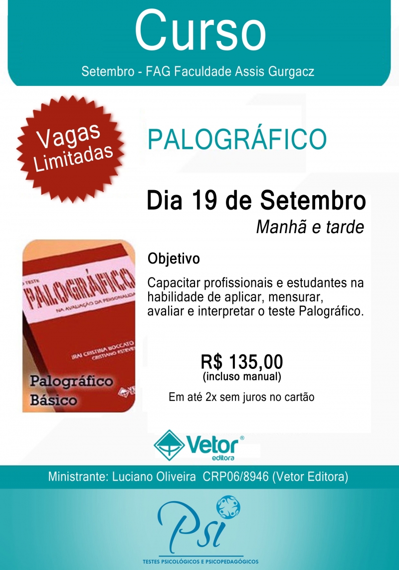 No dia 19 de setembro, o curso de Psicologia da FAG, em parceria com a PSI Testes, promove um curso sobre Teste Palográfico. O curso acontece durante a manhã e tarde e objetiva capacitar profissionais e estudantes de Psicologia na habilidade de aplicar, mensurar, avaliar e interpretar o Teste Palográfico. Trata-se de um teste projetivo (subjetivo) de grafismo que visa à avaliação da personalidade. E é muito utilizado por psicólogos recrutadores em diversos concursos e empresas.