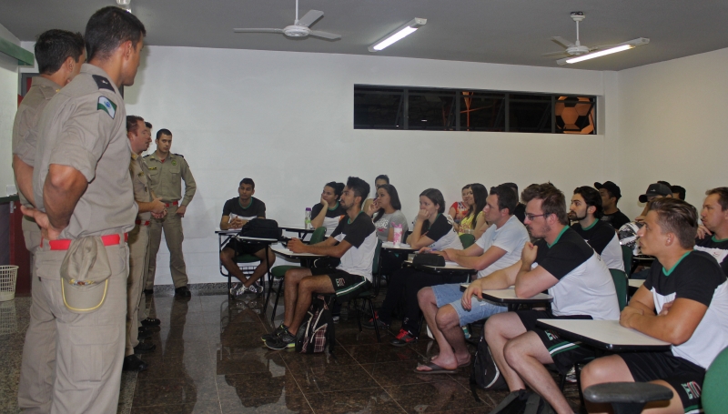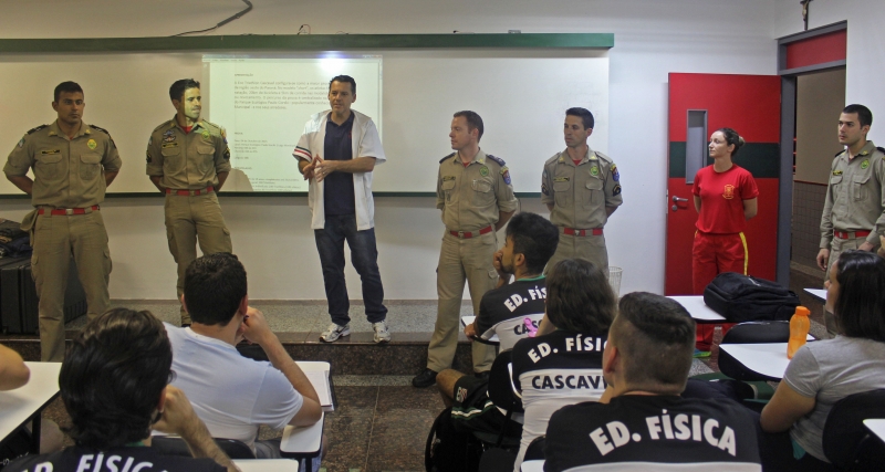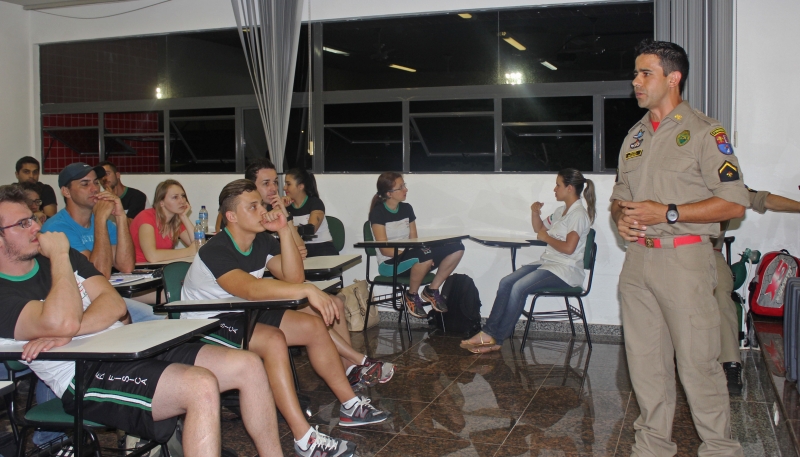 O Aspirante Felipe Elias Costa Vaz explica que a intenção do encontro com os alunos é tratar de Regras, Normativas e Estudos de Primeiros Socorros. "A estrutura da equipe com 200 colaboradores, sendo grande parte dos acadêmicos do 8º período da FAG, matutino e noturno. Na capacitação promovemos um treinamento específico na parte de atendimento pré-hospitalar, mobilização de possíveis fraturas, ressuscitação cardiopulmonar entre outros procedimentos necessários caso algum atleta venha a ter alguma lesão. São momentos de estudos teóricos e práticos, de modo que os alunos estejam aptos para nos auxiliar no dia do evento", explica o 1º tenente, André Luiz Ekermann.