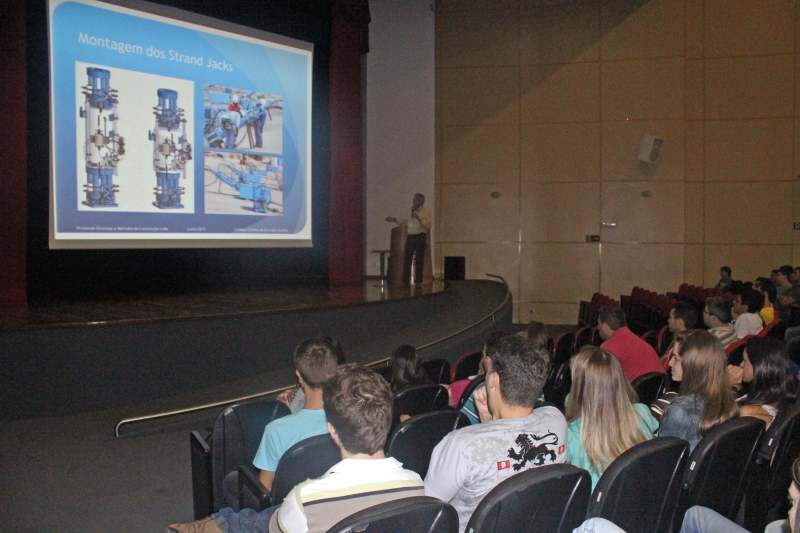 A palestra abordou todo o procedimento construtivo da cobertura do Estádio Nacional Mané Garrincha, em Brasília - DF, "desde a protensão do anel de compressão, montagem preliminar dos cabos radiais e anel de tração, o içamento do conjunto de cabos (heavy lift), posicionamento das treliças radiais com seus travamentos, até a fase final com a colocação das mantas de PTFE da cobertura", esclarece o professor.