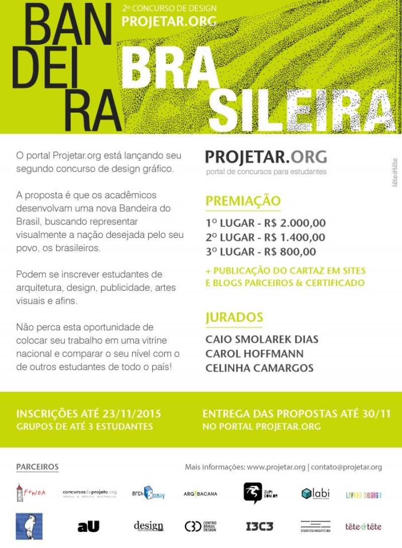 O portal Projetar.org, que promove concursos online para estudantes de Arquitetura, está lançando seu segundo concurso de design gráfico. A proposta é que estudantes universitários das áreas de Design, Comunicação, Artes e Arquitetura criem uma nova Bandeira do Brasil.