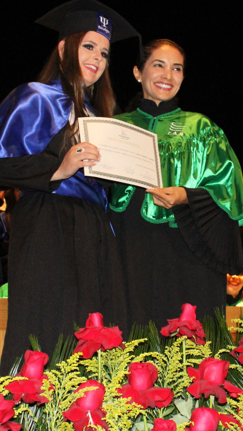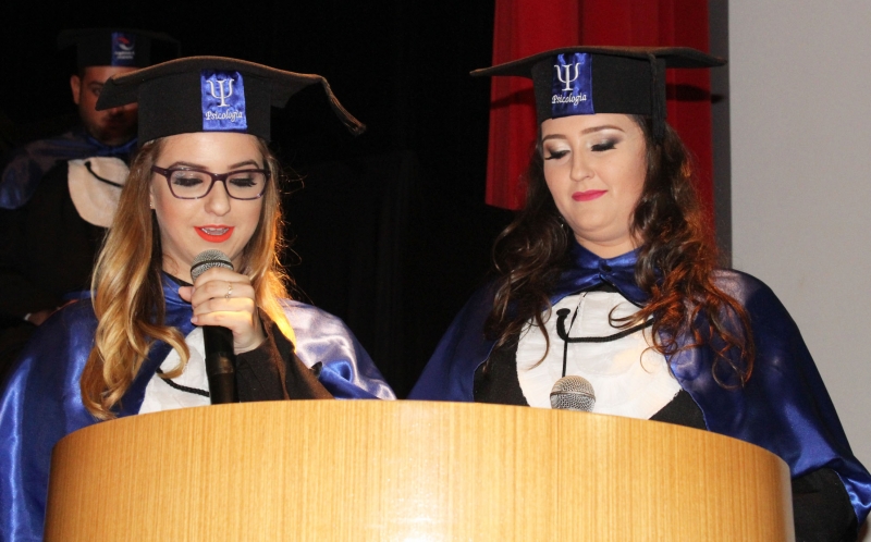 Os formandos de Psicologia homenagearam como Paraninfa a professora Aline Henriques Reis, a Patronesse a professora Juliana De Andrade Vilas Boas e o Homenageado como Nome de Turma professor Juliano Farias Nascimento. Também compõe a mesa de honra a Coordenadora do Curso professora Claudia Barbosa. A formada Leila Michelle Garcia foi responsável por proceder ao juramento. E a formada Taynara Querubin Moris e Tatiana Peiter, com grande descontração, apontaram os aprendizados dos cinco anos de curso. A Paraninfa professora Aline Henriques Reis, emocionada, demonstrou orgulho pelas formadas.