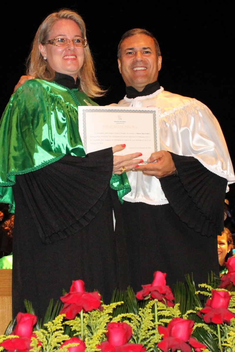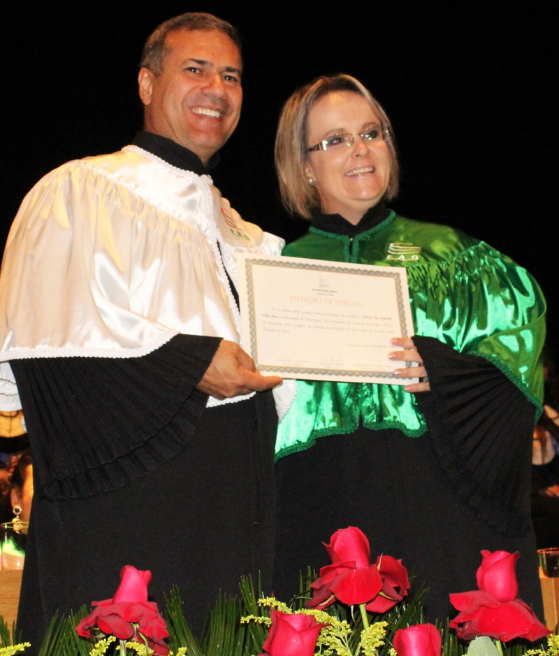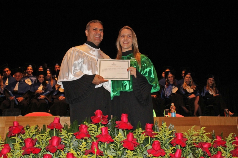 Ao final da cerimônia, Cinthia Cristina Vantini do curso de Arquitetura e Urbanismo e Janaina Zuck do curso de Psicologia foram homenageadas com a láurea acadêmica por obterem maior média de notas do curso.