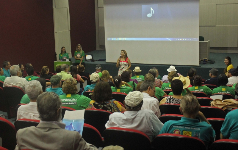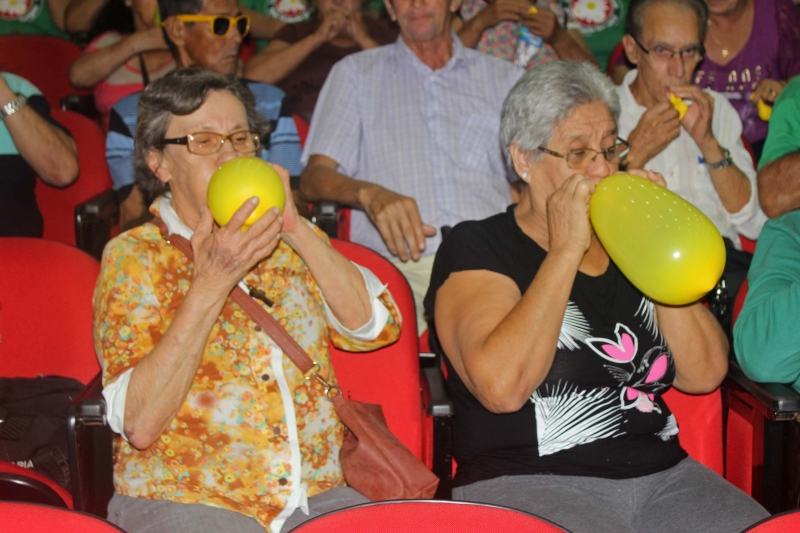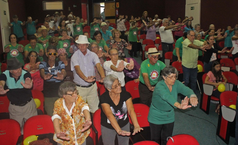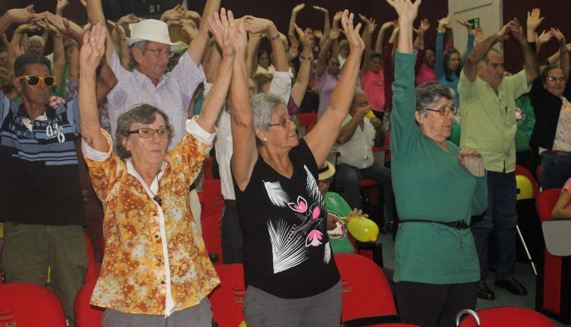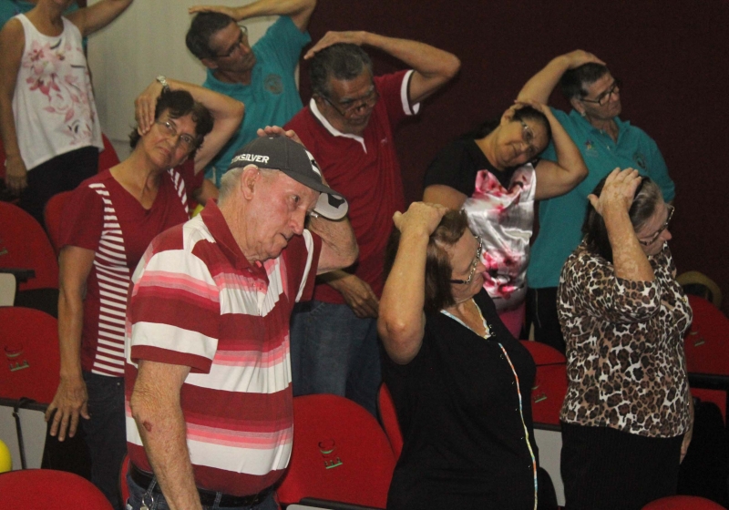 Após um primeiro momento de boas vindas, acadêmicas de Educação Física colocaram os idosos para se mexer, primeiro com um alongamento, depois com outras atividades lúdicas.