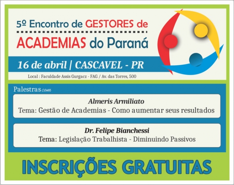 As inscrições são gratuitas e direcionadas a empresários, gestores e responsáveis técnicos de academias. Por causa da parceria com o Centro FAG também serão disponibilizadas vagas para acadêmicos de Educação Física.
