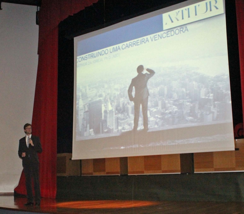Mais um grupo de calouros participou, ontem (15), de palestra motivacional com o tema "Construindo uma carreira vencedora", proferida pelo egresso de Engenharia de Controle e Automação, Arthur Schuler da Igreja.
