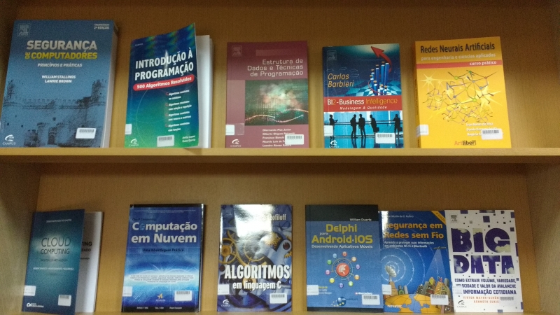 O acervo do curso de Sistemas de Informação, que já conta com vários exemplares de autores clássicos em diversas áreas da Computação, recebeu recentemente uma remessa de livros atualizados na área de Segurança da Informação, Business Inteligence, Redes Neurais, Computação em Nuvem, Algoritmos, Delphi e Big Data.