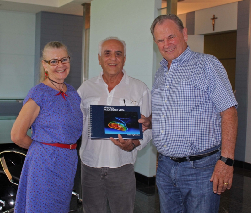 Na tarde de ontem (07), o arquiteto Nilson Gomes Vieira esteve no Centro Universitário FAG para presentear o Reitor Assis Gurgacz e a coordenadora de Arquitetura e Urbanismo professora Solange Smolarek Dias com uma publicação, contendo o seu currículo biográfico e acervo. Além do livro, o arquiteto também apresentou a Assis Gurgacz um estudo preliminar com soluções para o Trevo Cataratas.