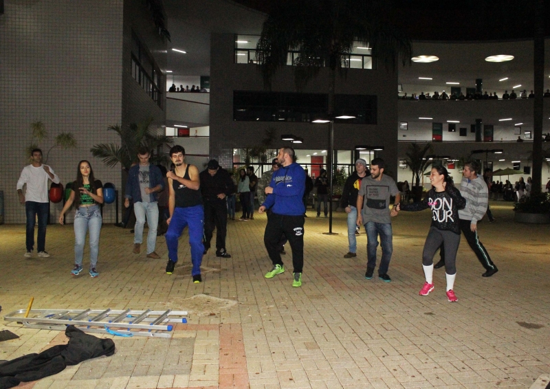 Os alunos do 7º período de Educação Física realizaram apresentação de dança na área de convivência do Bloco 1, na noite de ontem (10). O Flash Mob - aglomeração instantânea de pessoas para realizar ação inusitada - apresentou diferentes ritmos de dança, com estilos musicais bastante conhecidos.