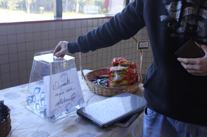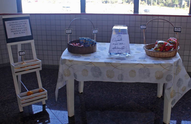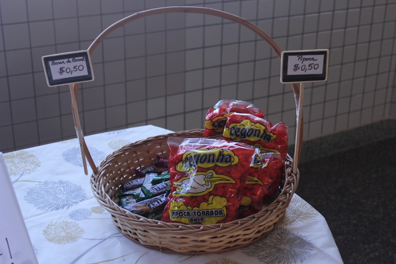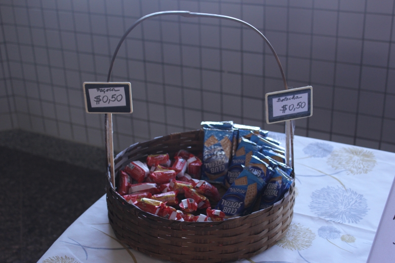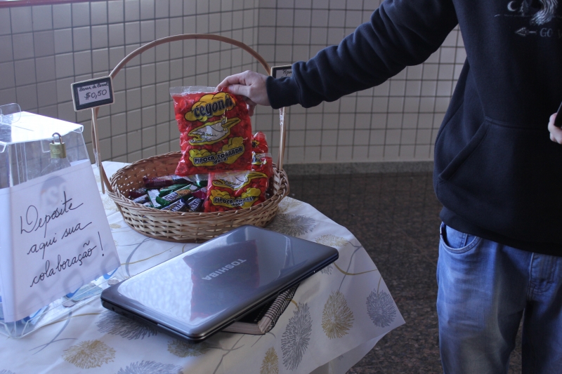 Foi disponibilizada uma mesa com alimentos disponíveis (pipoca, paçoca, biscoitos e barra de cereal) e uma urna para depósito do dinheiro. Sem vendedores no local, os alunos deveriam retirar o alimento de sua preferência e depositar o valor.