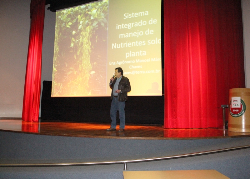 O palestrante Manoel Marcio Chaves que falou sobre o tema "Sistema integrado de manejo de nutrientes solo e planta", ilustrou sua palestra com a canção de Chico Buarque "O Cio da Terra". Já o agrônomo Claudio Heinzmann que falou sobre "Agricultura de Precisão e a Fertilidade do solo", revelou seus 13 anos de experiência na área específica e explicou aos alunos todo o processo de evolução e como levar a ferramenta de georeferenciamento para a propriedade do cliente.