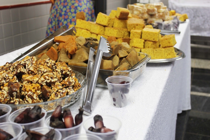 Após a dança, os idosos precisaram recarregar as energias. A continuidade da festa foi no próprio Centro de Convivência, onde uma mesa cheia de gostosuras juninas aguardava os participantes. Tinha bolo de fubá, pinhão, pé de moleque, batata doce e quentão.