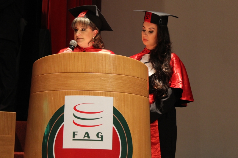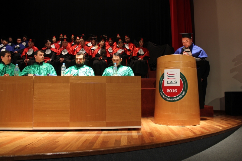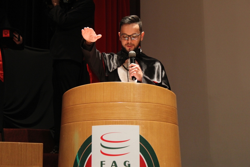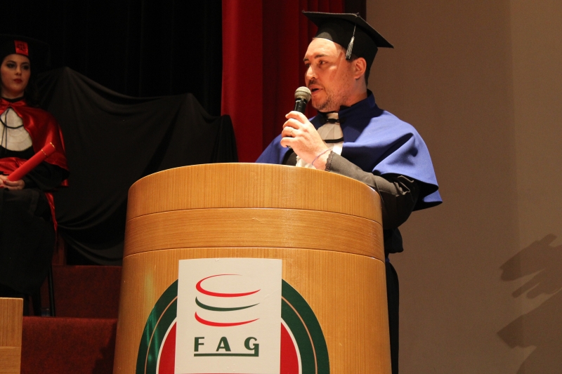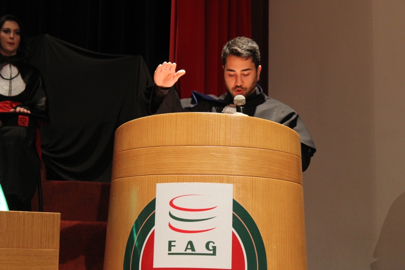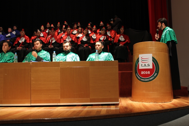 Dando continuidade à temporada de formaturas, o Centro Universitário FAG realizou ontem (14) a cerimônia de colação de grau dos acadêmicos de Direito e Engenharia Mecânica da instituição. A sessão solene foi presidida pelo Vice-Reitor, Sérgio De Angelis, e nela foram entregues 39 diplomas aos agora profissionais, que estão prontos para o mercado.