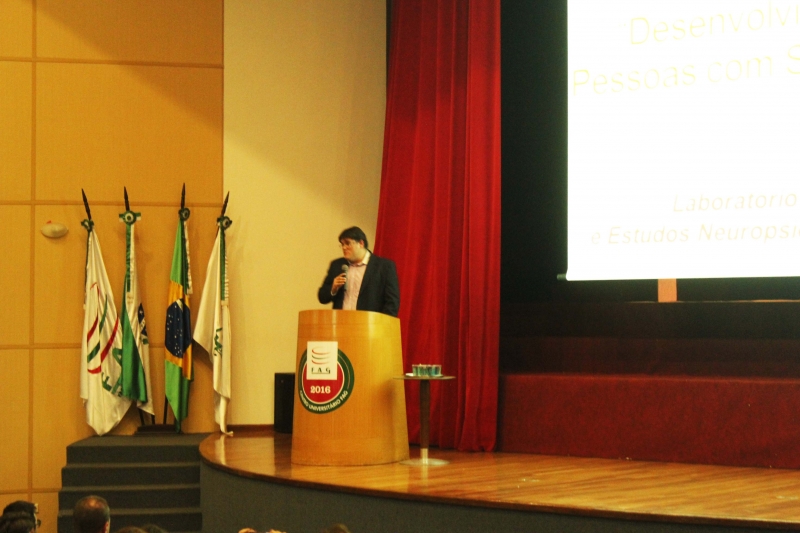 O Centro Universitário FAG recebeu ontem (10) o professor e neuropsicopedagogo, Fabrício Bruno Cardoso para ministrar a palestra intitulada: ?Desenvolvimento Motor de Pessoas com Síndrome de Down?. Atualmente, Fabrício é o pesquisador do Centro de Estudos em Neurociências e Educação (NEUROEDUC, UFRJ) e líder do grupo de Pesquisa em Sociedade, Saúde e Educação da Faculdade São Fidélis. Ele falou da importância de um encontro como esse, em que profissionais, futuros profissionais e pais puderam conhecer mais sobre a síndrome e como lidar com ela.
