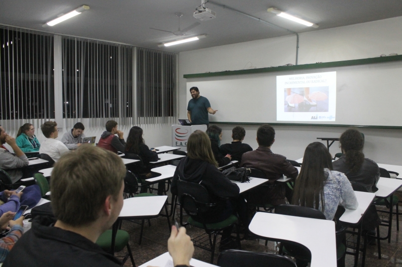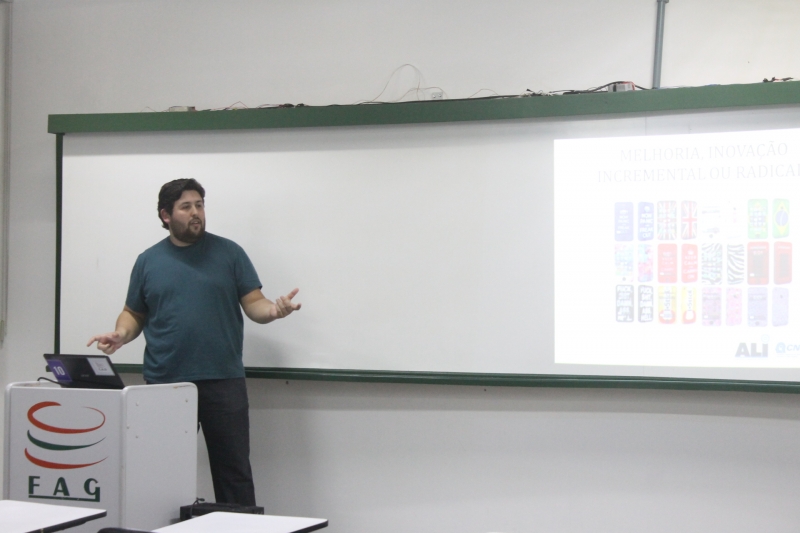 Os acadêmicos do 8º período do curso de Publicidade e Propaganda do Centro FAG estão participando semanalmente de atividades para dar suporte na elaboração dos Projetos Experimentais na reta final do curso. Na noite de ontem (11), os alunos participaram de uma oficina sobre Inovação com o Agente Local de Inovação do Sebrae, Marlon Ribeiro.