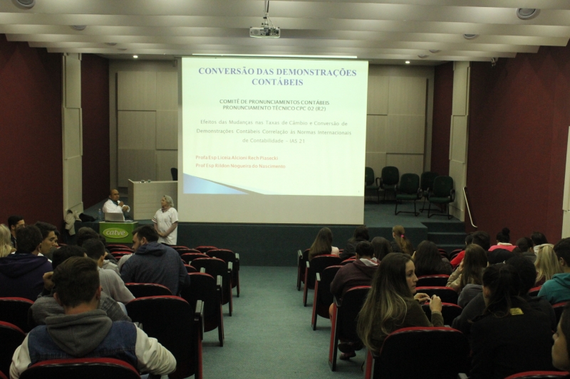 Na noite de ontem (15), os acadêmicos dos cursos de Ciências Contábeis e Direito do Centro Universitário FAG participaram da primeira noite da JINTEG - Jornada Integrada de Ciências Contábeis e Direito. No auditório do bloco IV os alunos de Ciências Contábeis tiveram uma palestra sobre "Conversão das Demonstrações Contábeis em Moeda Estrangeira", ministrada pelos professores: Licéia Acione Rech Piasecki e Rildon Nogueira do Nascimento.