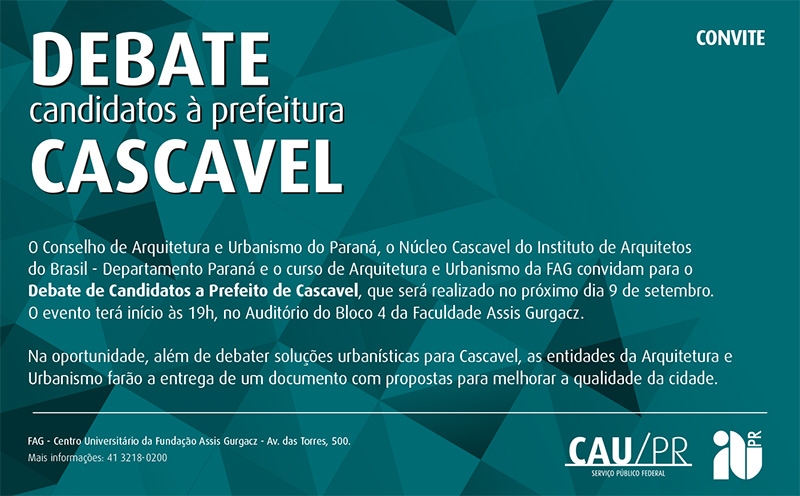 O Conselho de Arquitetura e Urbanismo do Paraná - CAU-PR, o Núcleo do Oeste do Paraná do Instituto de Arquitetos do Brasil - IAB Oeste PR e o Curso de Arquitetura e Urbanismo do Centro Universitário FAG - CAUFAG promovem, no dia 09 de setembro, às 19h, no Auditório do Bloco 4 do Centro FAG, debate com os candidatos a prefeito de Cascavel. O debate é aberto ao público em geral, mas as questões debatidas estão restritas aos temas ligados à arquitetura e urbanismo em Cascavel.